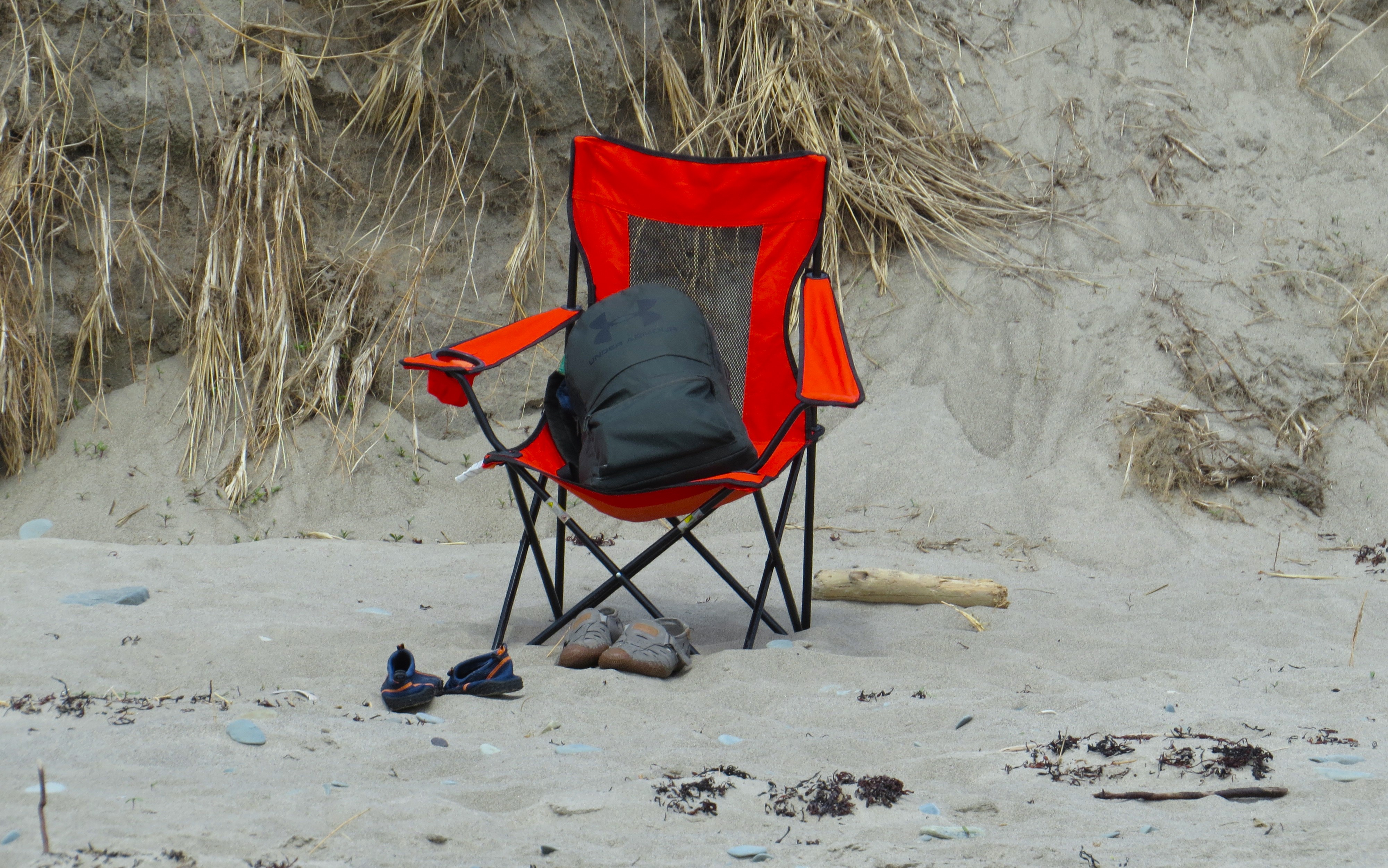 Po przejściu wydmy rozkładam swój ‘bazarek’. Muzyka oceanu bajeczna istotnie, wyciszająca domowe i osobiste niepokoje i neurastenie. I pusto prawie kompletnie na całej kilkukilometrowej długości. Rozkładam składane krzesło, zakładam kurtkę, bo wiatr jednak ciągnie. I spostrzegam, że nie przyniosłem torby z tomikami. Wracam przez piaski wydmy do samochodu i … torby nie zabrałem z domu! Cała przyczyna przyjazdu tu, w tą ciszę do jasnej Anielci!