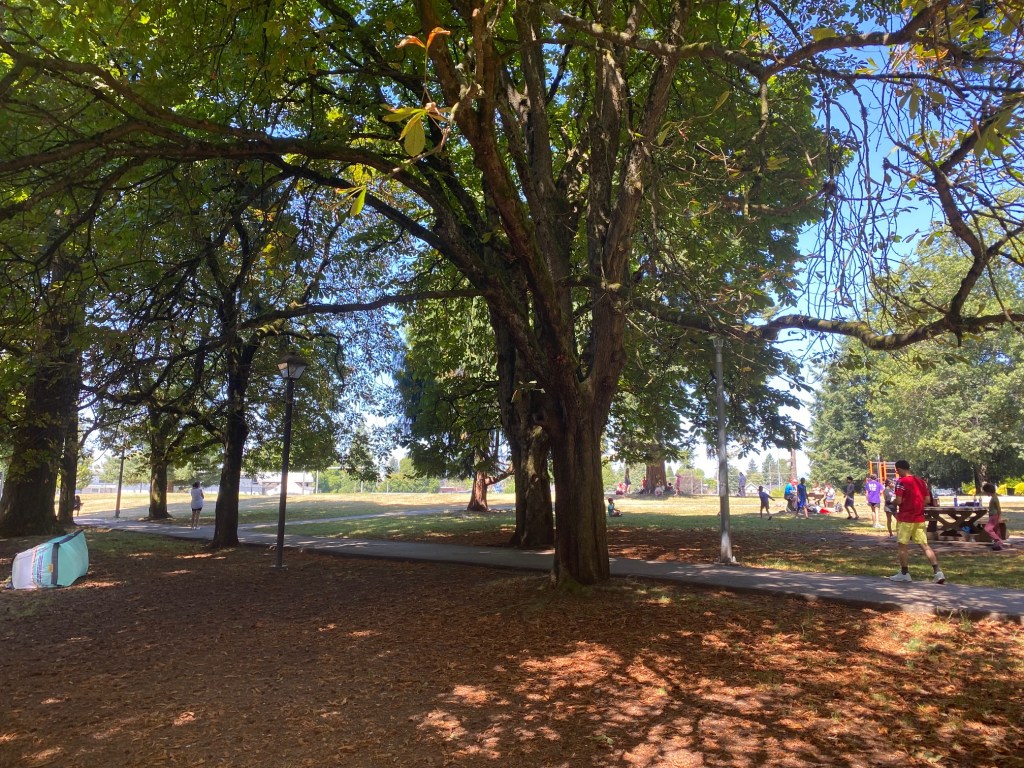 Wracając do granicy między New Westminster a Burnaby, do Moody Park. Administracyjnie leży całkowicie w granicach New West, między Ósmą i Dziewiątą Aleją (łatwy dojazd z centrum New West autobusami nr. 108 i 106). Szerokie alejki, bez silnych wzniesień. Dużo ławek samodzielnych i stołów drewnianych na grupowe spotkania. Uroczym i mądrze pomyślanym jest niewielki odkryty basen dla dzieciarni, ale i dla dorosłych (dwie oddzielone od basenu głównego linie do pływania szybszego i głębszego). Ewenementem kompletnie nie z tej strasznie drogiej planety, jaką jest Wielki Vancouver są … ceny wstępu. Dwa dolary od łepka, obojętnie czy z loczkami dziecięcym, czy bez jakichkolwiek loczków lub koloru białego, LOL. Brawo dla Rady Miejskiej – bo dwa dolary to prawdziwie przystępna cena dla każdego.
